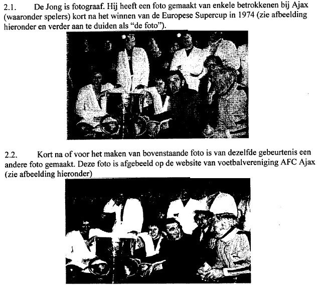 De Jong is fotograaf en heeft een foto gemaakt van enkele Ajax-spelers kort na het winnen van de Europese Supercup in 1974 . Tussen Supportersvereniging Ajax (SVA) en De Jong is een vaststellingsovereenkomst gesloten, waarin onder meer werd opgenomen dat er een lijst met "discutabele dia's" is en dat de foto's in deze lijst aan De Jong toekomen. DGOT heeft de foto op haar website openbaargemaakt zonder toestemming. Bewijswaardering: "De enkele stelling dat printscreens en uitdraaien van webpagina's kunnen worden gemanipuleerd en dat de informatie op www.archive.org niet als een betrouwbare bron kan worden aangemerkt, is namelijk niet als een voldoende onderbouwd verweer te beschouwen.