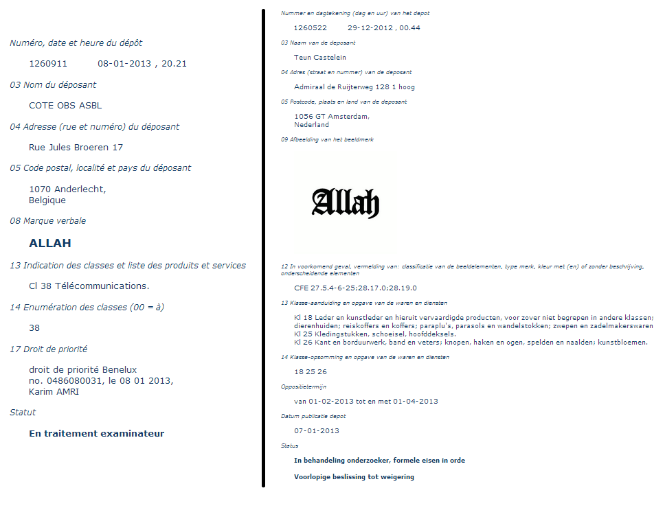Gisteren is de voorlopige beslissing van het BBIE tot weigering beeldmerk Allah 8 januari 2013, depotnr. 1260522 (Allah) gepubliceerd, IEF 12213, vandaag treffen we in het Benelux merkenregister een nieuw depot aan voor het WOORDmerk ALLAH voor telecomdiensten.
