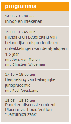Tijdens deze bijeenkomst zullen  Joris van Manen (Hoyng Monegier LLP) , Paul Reeskamp (Klos Morel Vos & Schaap) en Christien Wildeman (Kennedy Van der Laan) belangrijke en actuele jurisprudentie de revue laten passeren, waarbij zowel merkenrecht, als modelrecht als procesrechtelijke aspecten aan bod komen. In slechts 3 uur bent u volledig op de hoogte over de actuele ontwikkelingen in de rechtspraak.