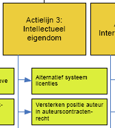 Actielijn 3: intellectueel eigendom: Deze actielijn is onderverdeeld in drie initiatieven: Creative Commons, auteurscontractenrecht en voorlichting verbeteren. (...) Voor actielijn 3 geldt dat over het geheel genomen de uitvoering en opbrengsten redelijk goed zijn te noemen. Alleen bij de wijziging van het auteurscontractenrecht heeft vertraging plaatsgevonden. Dit initiatief is echter wel van wezenlijk belang om geconstateerde knelpunten weg te kunnen nemen