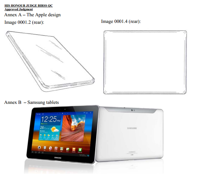 Modellenrecht. Samsung/Apple in het buitenland, Verenigd Koninkrijk [vergelijk: US District Court California, IEF 11502]. Interessant is het onderdeel waarin de rechter de uitkomst van de Duitse en Nederlandse gerechtelijke procedures afwijst [IEF 10819]. De geïnformeerde gebruiker treft op de achterzijde van de Samsung Galaxy Tablets ongebruikelijke details die de totaalindruk anders maken: