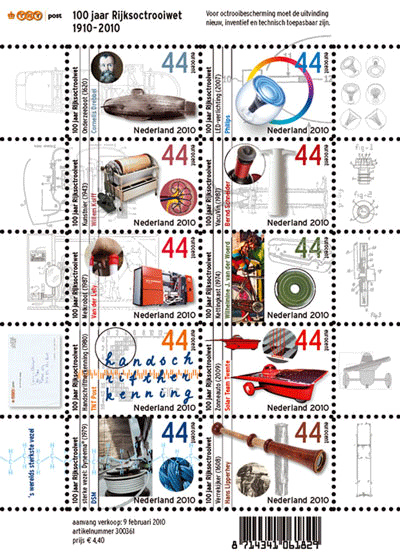 ‘Op donderdag 11 februari 2010 is in de kunsthal in Rotterdam tijdens een feestelijke bijeenkomst officieel het eerste velletje octrooipostzegels uitgereikt. TNT post maakte, naar aanleiding van een aanvraag van de heer G. Kleisterlee van Philips en mevrouw M. Van der Hoeven, minister van Economische Zaken, tien speciale octrooipostzegels, naar aanleiding van het jubileumjaar van de Rijksoctrooiwet.