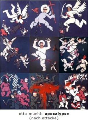 De omstreden Oostenrijkse kunstenaar Otto Mühl maakte eind jaren ’90 een kunstwerk met de naam ‘Apocalyps’. Op het doek was een dertigtal naakte personen afgebeeld, waarvan een aantal aan het masturberen en ejaculeren was. Voor de gezichten van die personen waren foto’s van bekende en minder bekende personen gebruikt (oa. moeder Theresa en Jörg Haider). Ook Meischberger, bestuurder van de politieke partij FPÖ, was op deze wijze afgebeeld, met een balkje voor zijn ogen. Hieronder een foto van dat kunstwerk, dat zoveel weerstand opriep dat het door een bezoeker van de tentoonstelling met rode verf werd beklad. Meischberger was ondanks deze bekladding nog steeds min of meer herkenbaar, en eiste dat het schilderij niet langer tentoongesteld zou worden. De Oostenrijkse rechter – niet de grootste voorvechter van vrijheid van meningsuiting – wees die vordering toe. Meischberger kreeg zelfs een schadevergoeding.