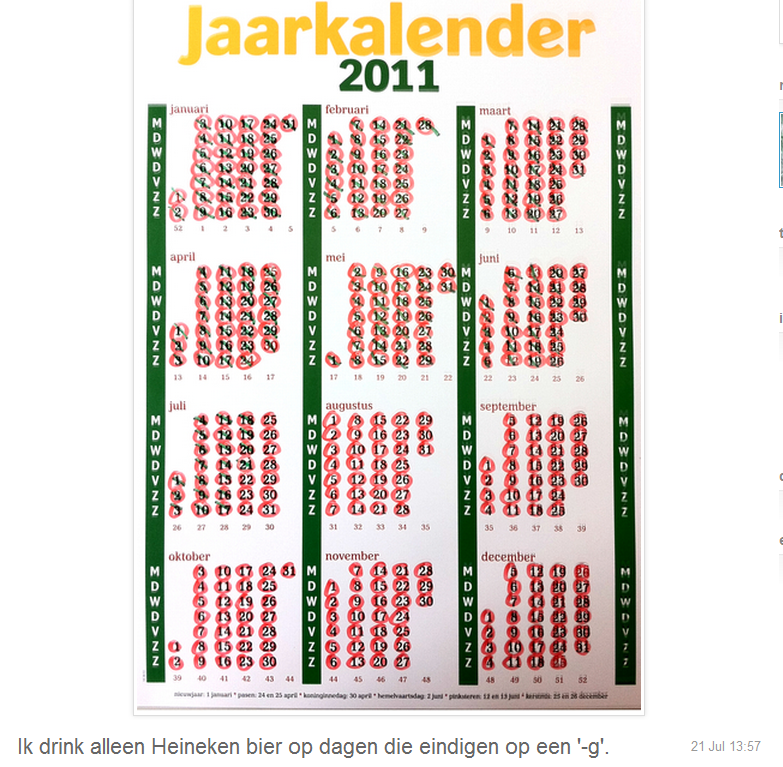 Reclamerecht. Merkenrecht. Vanaf het twitter-account Heineken_NL is de volgende tekst gestuurd: “Ik drink alleen Heineken bier op dagen die eindigen op een ‘-g’. – https://moby.to/yup0bg” (klik afbeelding voor vergroting) De link leidt naar een afbeelding van een kalender waarop alle dagen zijn omcirkeld.